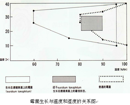 ??? 顯微鏡的光學表面都有防霉系統(tǒng),各個廠家都是采用化學藥品鍍膜防霉,一般有效期大約在7-8 年左右,超過8 年以后,防霉系統(tǒng)會失效,此時,應該找顯微鏡廠家重新安置防霉片,否則,實驗室條件差的顯微鏡會開始長霉,南方潮濕地區(qū)特別顯著,霉菌會分泌有害物質腐蝕玻璃表層的鍍膜層,霉菌密度大時危害特別大,這樣會嚴重危害顯微鏡的光學性能,因為鍍膜層是光學顯微鏡性能的關鍵所在。上圖是霉菌生長與溫度和濕度的關系圖(僅供參考)。