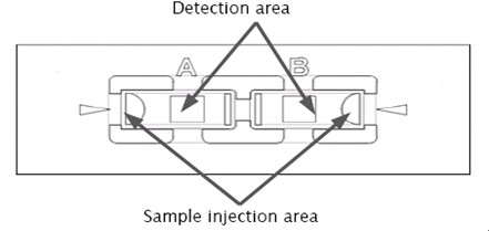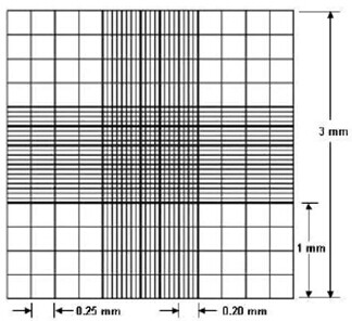 C-Chip (DHC-N01)是用于手工計(jì)數(shù)的一次性塑料血球計(jì)數(shù)板, 不但能精確的控制體積,而且操作簡(jiǎn)單。包括兩個(gè)閉合的小室,每個(gè)小室有兩個(gè)樣品進(jìn)出口(圖2)。DHC-N01格柵和改良式紐鮑爾格柵很相似。包括九個(gè)大格,每個(gè)大格為1×1mm ,每格深度為0.1mm。每個(gè)大格總體積為0.1mm3或者10-4cm3(1)。正中心的一個(gè)大格經(jīng)過三重分割又被分成25個(gè)小格,四角上的四個(gè)大格分別被分成16個(gè)小格。