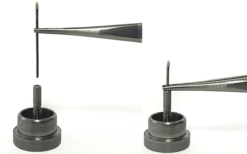 MicroMounts™裝配在一個(gè)無磁不銹鋼柱形針上,不銹鋼柱形針的直徑大約0.64mm。鋼柱長(zhǎng)度18mm/SPINE,其它規(guī)格11mm,19mm,25mm也提供(購(gòu)買時(shí)需指出)。因?yàn)殇撝闹睆?span lang="EN-US">0.64,我們也可以用0.7mm的自動(dòng)鉛筆來作為拿取桿子,夾取MicroMounts™需要一把尖部帶齒的鑷子。