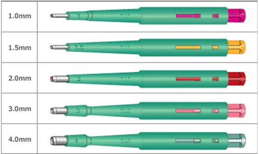 截取細(xì)微樣本的得力助手!光滑鋒利的刀頭,精巧的樣本彈射,以及拿捏部位的防滑設(shè)計(jì)等均獨(dú)具匠心!每種尺寸清晰標(biāo)于桿上,不同顏色的按鈕便于辨識(shí)。