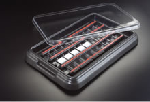 StrainTray的盒體呈黑色,由硬質(zhì)ABS塑料制造,對廣泛的化學(xué)試劑均惰性(氯代烴類除外)。盒內(nèi)支架有四個(gè)橫桿,玻片置于橫桿上,上面再壓上聚酯條,這樣可以很牢固的夾住玻片,盒體即使傾斜也沒有問題。橫桿之間的特殊設(shè)計(jì)可以防止液體飛濺。支架升高可以防水打濕玻片,另外升高的支架可以很方便的拿取玻片。盒體的底部有四個(gè)橡膠墊使其很穩(wěn)固地置于桌面上。盒子和盒子可以疊放,這樣可以節(jié)約很多空間。