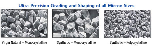 Glennel®金剛石研磨膏可以分為天然單晶型、人造單晶型、人造多晶型三種(大小從1/10μm到60μm)。這三種晶體的外形圖片見下: