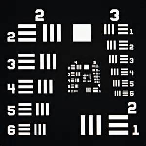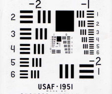 美國(guó)空軍1951年分辨力測(cè)試圖一直是世界上檢測(cè)垂直與水平分辨力的通用標(biāo)準(zhǔn),是符合MIL-STD-150A標(biāo)準(zhǔn)的分辨力測(cè)試圖案,由美國(guó)空軍于1951年創(chuàng)建。1951 USAF分辨力測(cè)試圖目前仍廣泛地應(yīng)用于測(cè)試光學(xué)成像系統(tǒng)(如顯微鏡和相機(jī))的分辨能力。這種圖案包括幾組由三條短線構(gòu)成組合,短線的尺寸從大到小。成像系統(tǒng)無法辯明的最大短線組為其分辨能力極限。