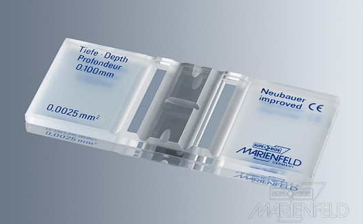 德國原裝進口Marienfeld血球計數(shù)板,改進牛鮑型(Neubauer-improved),由特殊光學玻璃制成,每板有2個計數(shù)池,H型凹槽,帶有歐盟CE標識。Bright-Line(0650030)為金屬亮線型,Dark-Line(0650010)為蝕刻暗線型。本產(chǎn)品有特殊設計的V型槽,可引導液體的加入,防溢流現(xiàn)象發(fā)生。計數(shù)池深度為0.1mm,適用于紅、白血球、血小板、細胞。