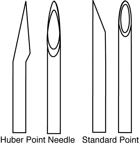 提倡用此針配套植入式輸液港或者肝素帽使用,可以大大延長(zhǎng)植入式輸液港或肝素帽的壽命。普通注射針和Huber注射針對(duì)植入式輸液港的隔膜進(jìn)行了穿刺落屑比對(duì)試驗(yàn),結(jié)果表明,采用Huber注射針穿刺后的落屑數(shù)均明顯少于普通注射針的試驗(yàn)結(jié)果(huber注射針又稱不落屑針)。這是因?yàn)?/span>Huber注射針的針尖采用了獨(dú)特的幾何形狀,防止或者減少了取芯作用(針頭穿過(guò)材料時(shí)一部分進(jìn)入到針尖附近腔中的現(xiàn)象)。