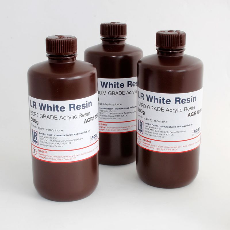 LR White樹脂現(xiàn)有硬、中和軟3種等級(jí)的產(chǎn)品,大多數(shù)科研工作者更喜愛硬和中級(jí)產(chǎn)品。現(xiàn)在銷售的產(chǎn)品并不是即用型的(prefixed form-ready to use),而是非催化版本(non-catalyzed version):樹脂+催化劑(500g resin+9.9g Benzoyl Peroxide)。使用LR White樹脂聚合包埋之前,在室溫下,催化劑成比例的加入樹脂,馬上進(jìn)行搖勻使之充分溶解,這一過程在室溫下大概需要24小時(shí),千萬(wàn)不能試圖加快催化劑的溶解來加熱!充分溶解混勻的樹脂必須重新放回4℃來保證它的有效期,一般混勻的樹脂小心保存能保存半年到一年(這是本本上寫的,建議很快用完哦?。?/span>