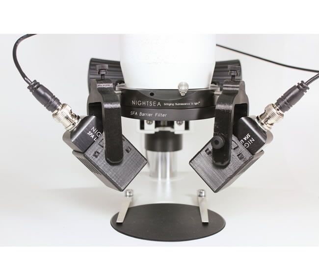 燈使用上可選的配件:燈頭吊架和電纜線。如果覺得鵝頸燈的角度滿足不了自己的需求,可以購買吊架和電纜線,吊架可安裝到SFA適配圈上任何一個螺釘?shù)哪┒?。燈頭吊架有兩個不同的樞軸臂長度,用于長和短的工作距離。從鵝頸上移除燈頭,裝入吊架,并將其安裝在SFA適配圈上,用電纜線直接連接燈頭和燈座。其實可以一個燈座連接雙線電纜,安裝兩個燈頭和兩個吊架,你就有雙倍的激發(fā)強度。