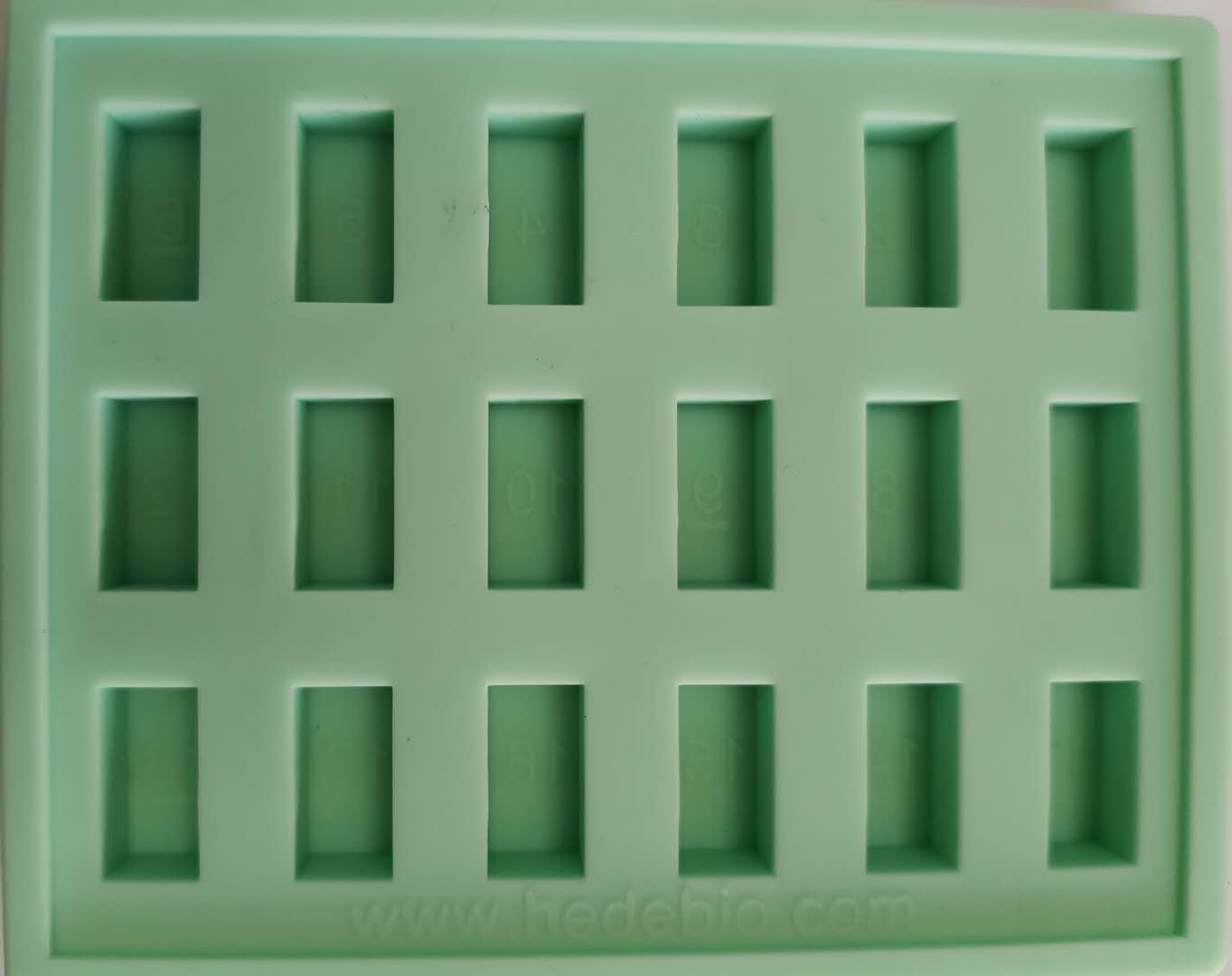 淡綠色的18槽硅膠模具,長(zhǎng)寬為130×100mm,槽大小為20×10,10mm,可以與骨髓塑料切片試劑盒配套使用,也可以用于JB-4等樹(shù)脂包埋。